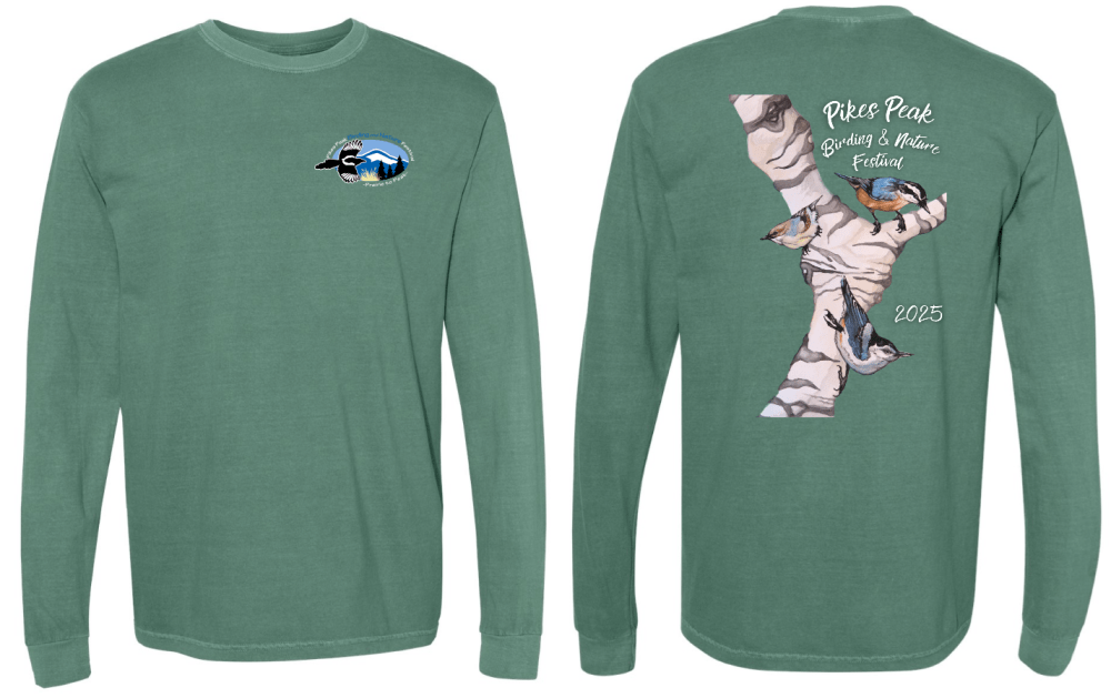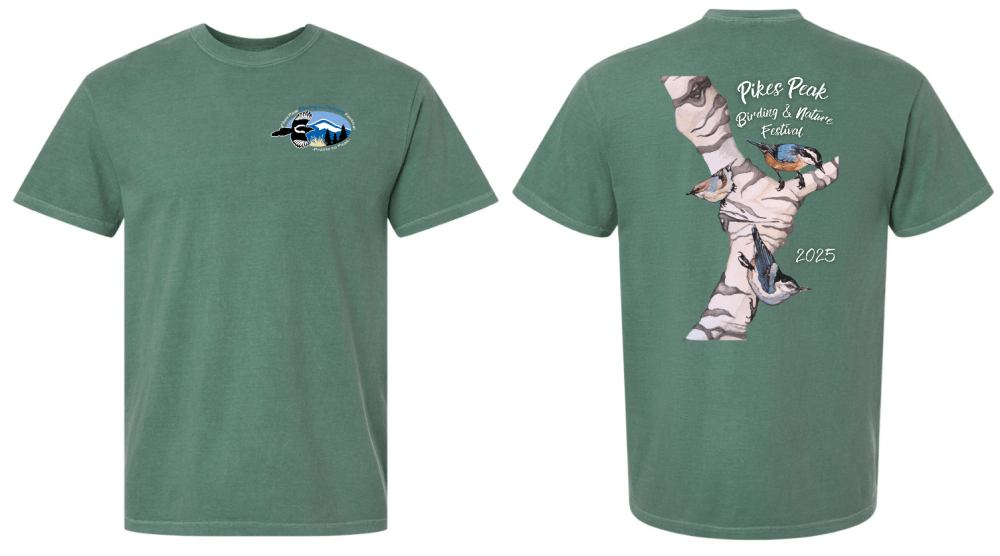 Mary’s artwork graces the back of the 2025 festival T-shirt, with the Pikes Peak Birding & Nature Festival logo on the front.
